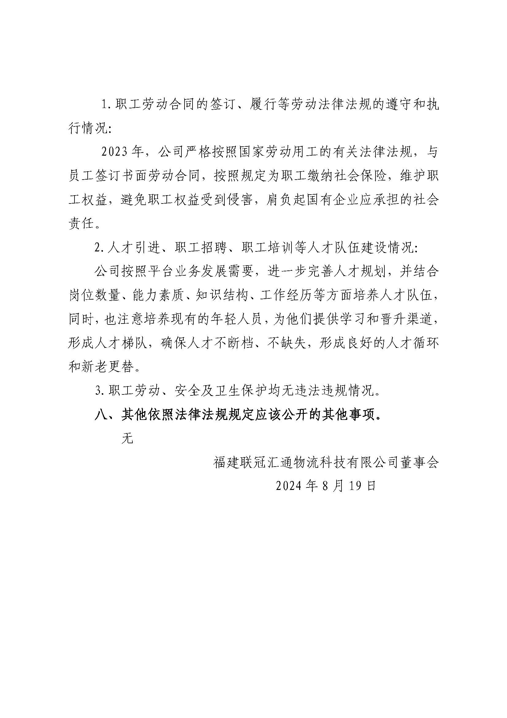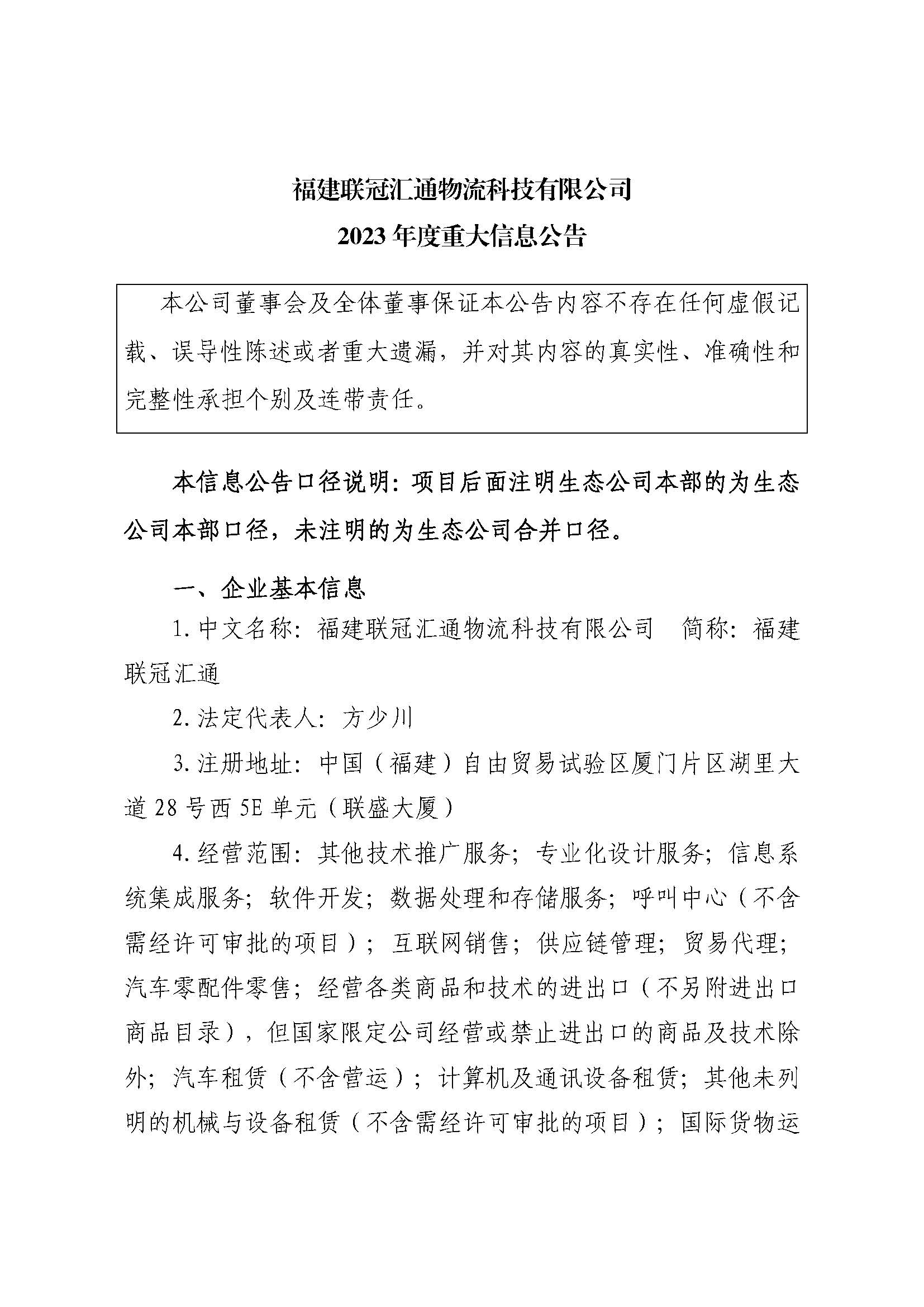 福建联冠汇通物流科技有限公司2023年度重大信息公告