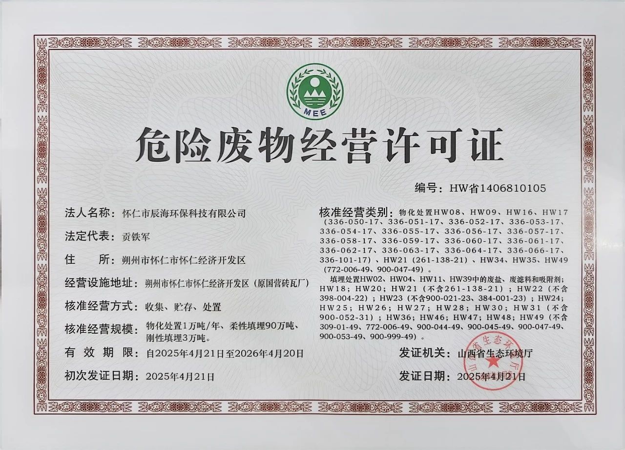 近日,怀仁市辰海环保科技有限公司(以下简称“辰海环保”)正式收到山西省生态环境厅颁发的《危险废物经营许可证》,这标志着辰海环保可依法开展危废处置业务,为助力山东环保集团和ok138太阳集团拓宽营收渠道,扩大市场份额奠定了坚实基础。