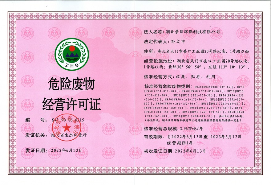 近日,经湖北省生态环境厅审核通过,湖北景目环保科技有限公司成功申领危险废物经营许可证,经过核准经营危险废物类别包括HW46、HW50两大类包含的16小类,标志着景目环保将正式进入试生产阶段。